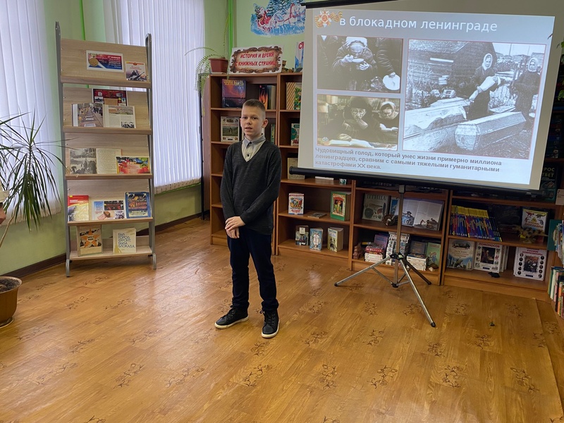 Ведущая Пипченко Т. А. рассказала ребятам о страшных событиях Великой Отечественной войны, о том, как фашисты вышли к Ленинграду, отрезав город от всей страны, о тяжёлых испытаниях, выпавших на долю жителей осаждённого города. Юные слушатели узнали про Ладожское озеро и почему его назвали «Дорогой жизни», о блокадном хлебе. Особенными чувствами школьники прониклись к судьбе маленькой девочки Тани Савичевой. Её дневник стал одним из символов Великой Отечественной войны.