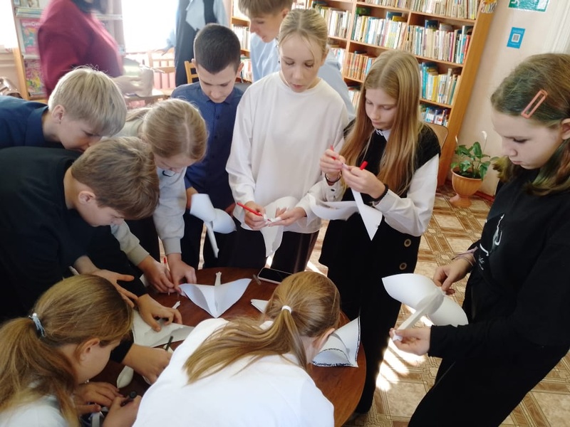 В Суражской городской детской библиотеке 22 октября прошёл час памяти «И превратились в белых журавлей». Мероприятие посетили учащиеся 6 «Б» класса МБОУ СОШ №2. В начале мероприятия, библиотекарь (Колесникова Н.А.) рассказала ребятам о том, как появился этот праздник, почему символом его стали журавли. Под песню "Журавли" почтили память погибших солдат минутой молчания. Дети проникновенно читали строки о мужестве, стойкости и любви к Родине. В их исполнении звучали произведения известных поэтов-фронтовиков, а также стихи современных авторов, затрагивающие тему войны и мира. Книжная выставка, организованная сотрудниками библиотеки, представила широкий спектр литературы, посвящённой военной тематике. Ребята с интересом рассматривали книги, выбирали для себя наиболее интересные и значимые произведения. Акция с изготовлением бумажных журавликов стала трогательным завершением мероприятия. Каждый участник, складывая фигурку белой птицы, вкладывал в неё частичку своей души, свои мысли и чувства. Эти самодельные журавлики стали символом надежды, символом мира и памяти о тех, кто отдал свои жизни за будущее.
