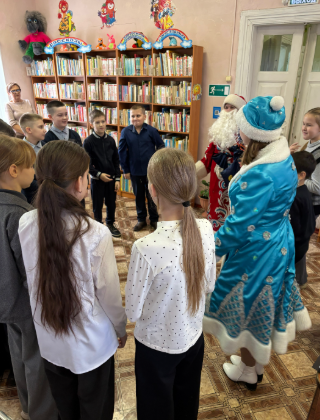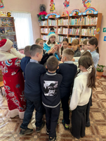 Мероприятие посетили учащиеся 4 «А» класса МБОУ СОШ №1 (учитель Слонская А.К.). Из рассказа библиографа (Поволяко Е.И.) ребята узнали интересную информацию о том, как отмечали Новый год наши далекие предки, а затем каждый смог поучаствовать в различных конкурсах. Больше всего детей порадовали Дед Мороз и Снегурочка, которые появились на празднике с подарками. В программе были танцы, песни, игры с героями, мальчишки и девчонки рассказывали стихотворения и водили хороводы. Разноцветные, сверкающие гирлянды и ярко украшенная ёлочка принесли детям ощущение чуда. Юные читатели смогли окунуться в праздничную атмосферу приключений, поучаствовать в интересных конкурсах.